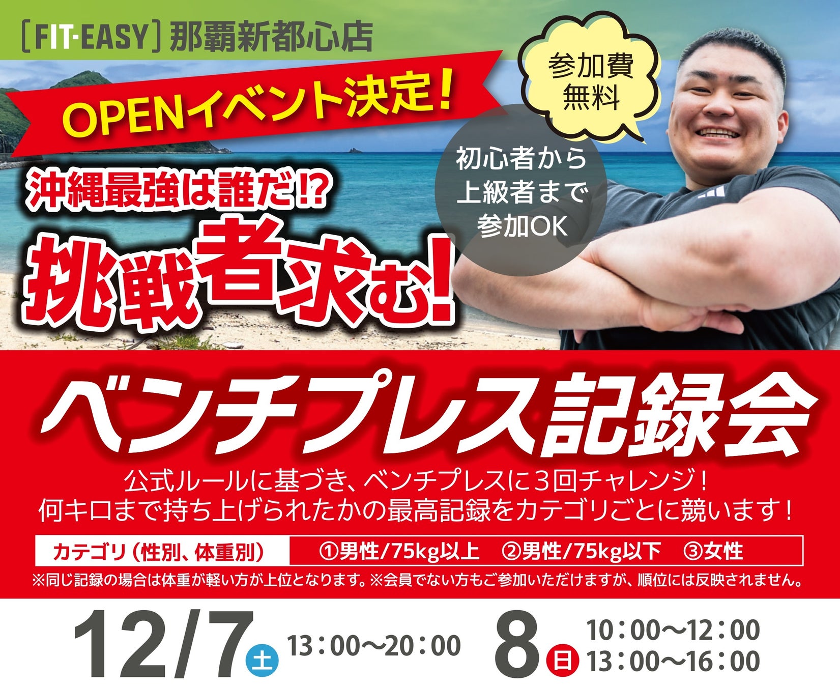 全国にアミューズメントフィットネスクラブを展開するフィットイージー株式会社 (本社:岐阜市)は沖縄初出店となる那覇新都心店のグランドオープンを記念し、12月7日(土)と8日(日)にベンチプレス元日本記録保持者の山本貴之氏によるベンチプレス記録会を実施します。講師によるアドバイスもあり、初心者から上級者の方までお楽しみいただけるイベントとなっております。