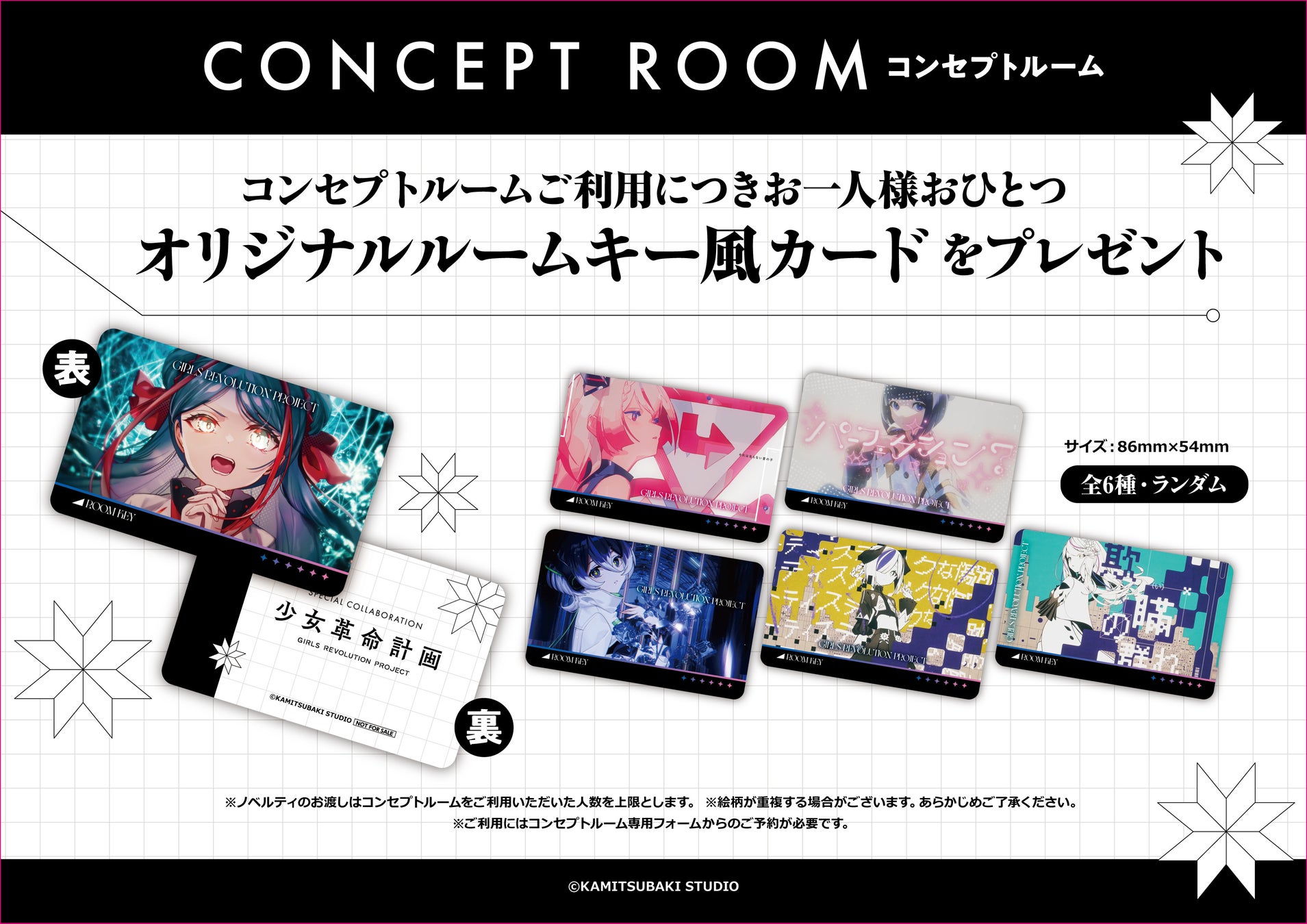 コンセプトルームをご利用につき、オリジナルルームキー風カードを全6種の中からランダムで、ご利用者様お1人につき1点をお渡しいたします。