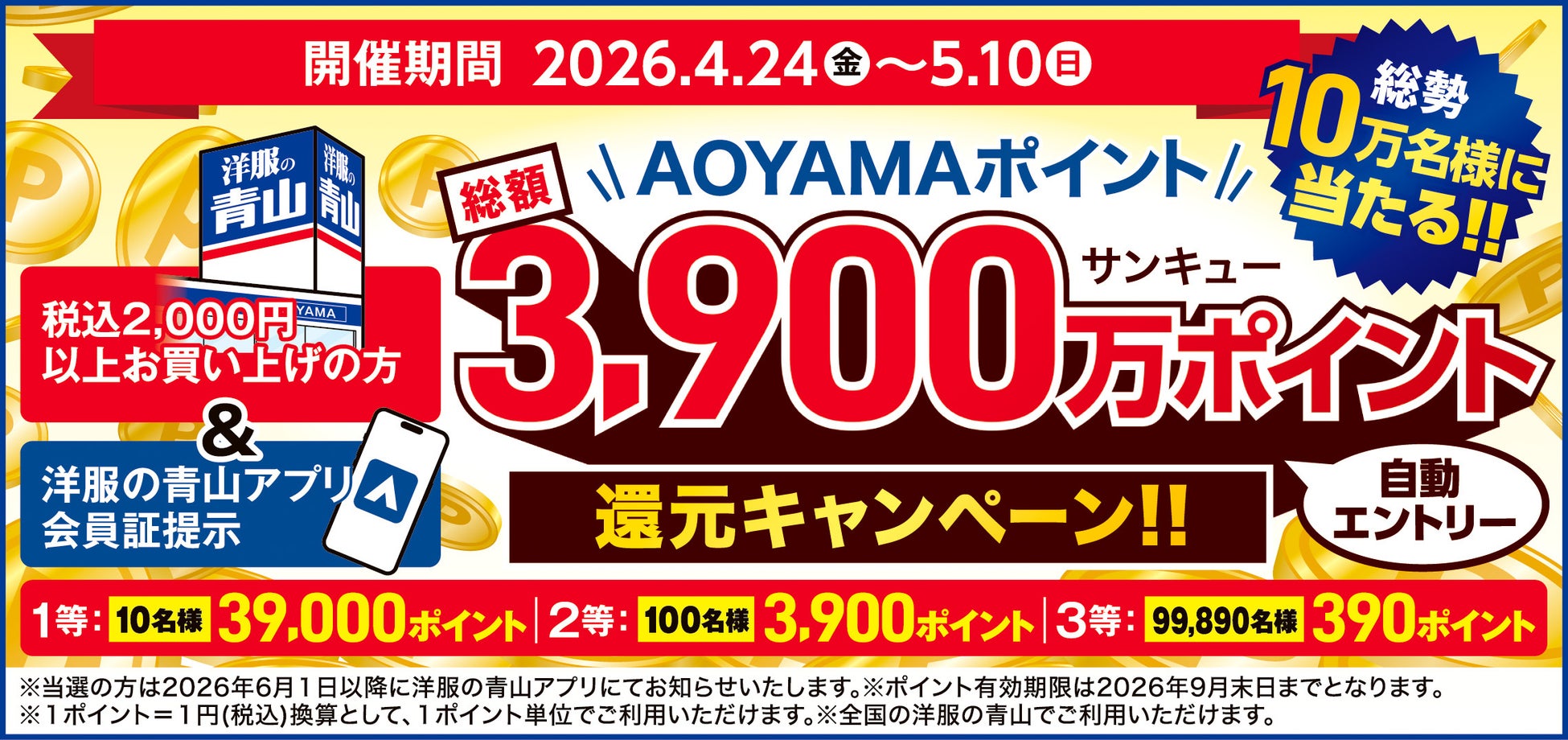 青山商事株式会社(本社:広島県福山市/代表取締役社長:遠藤 泰三)は、5月6日(水)に迎える「創業記念日」にあたり、日頃のご愛顧に感謝を込めて、2026年4月24日(金)から5月10日(日)まで、全国の「洋服の青山」および公式オンラインストアにて、最新のクールビズアイテムを特別価格で提供する「創業感謝祭」を開催いたします。