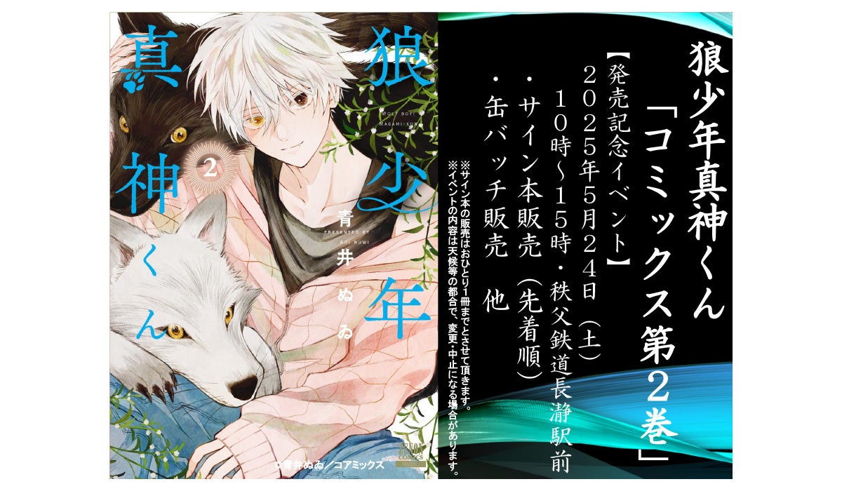 株式会社コアミックス(東京都武蔵野市)は、『狼少年真神くん』第2巻(青井ぬゐ)を5月20日に発売いたします。発売を記念し、舞台となる長瀞町で記念イベントを5月24日に開催いたします。イベントでは、先着でサイン入りコミックスを販売し、イラストカードも配布いたします。さらに、初のグッズとなる缶バッジも販売いたします。