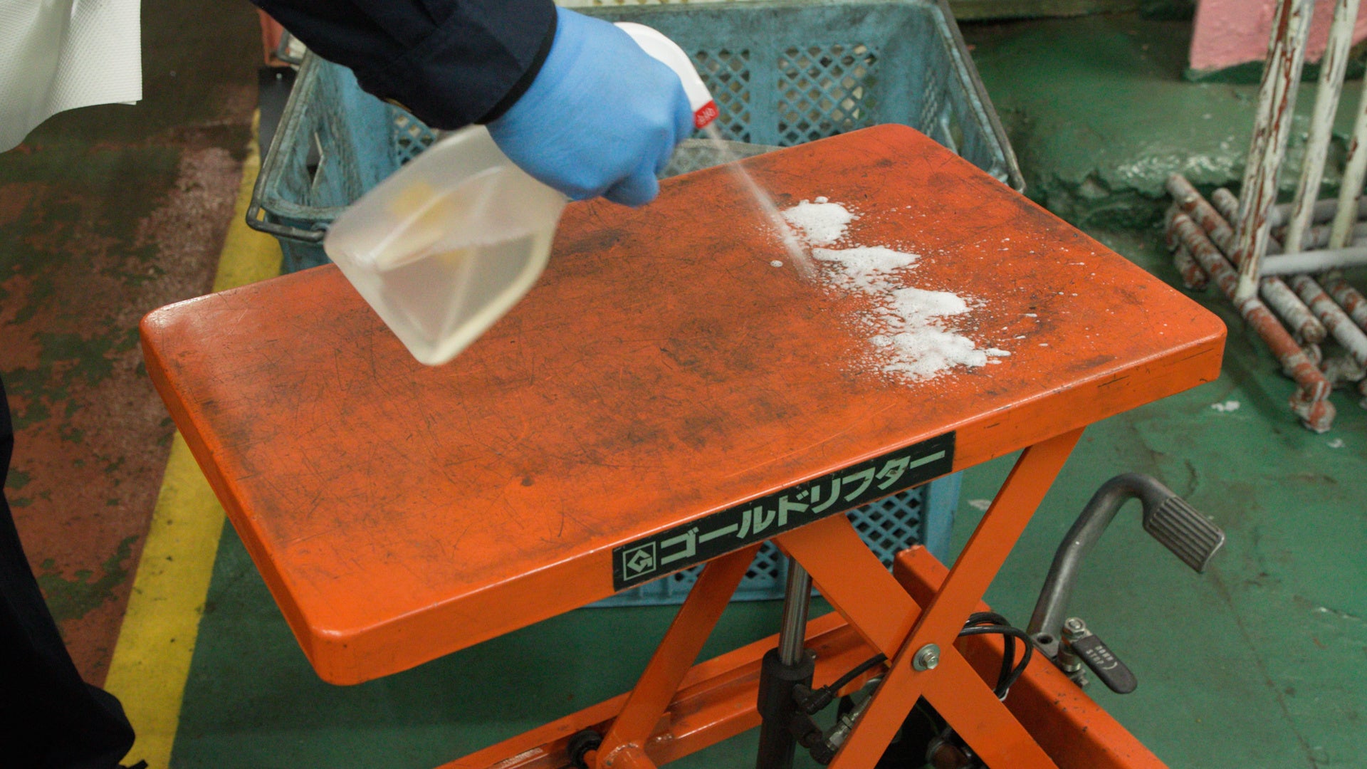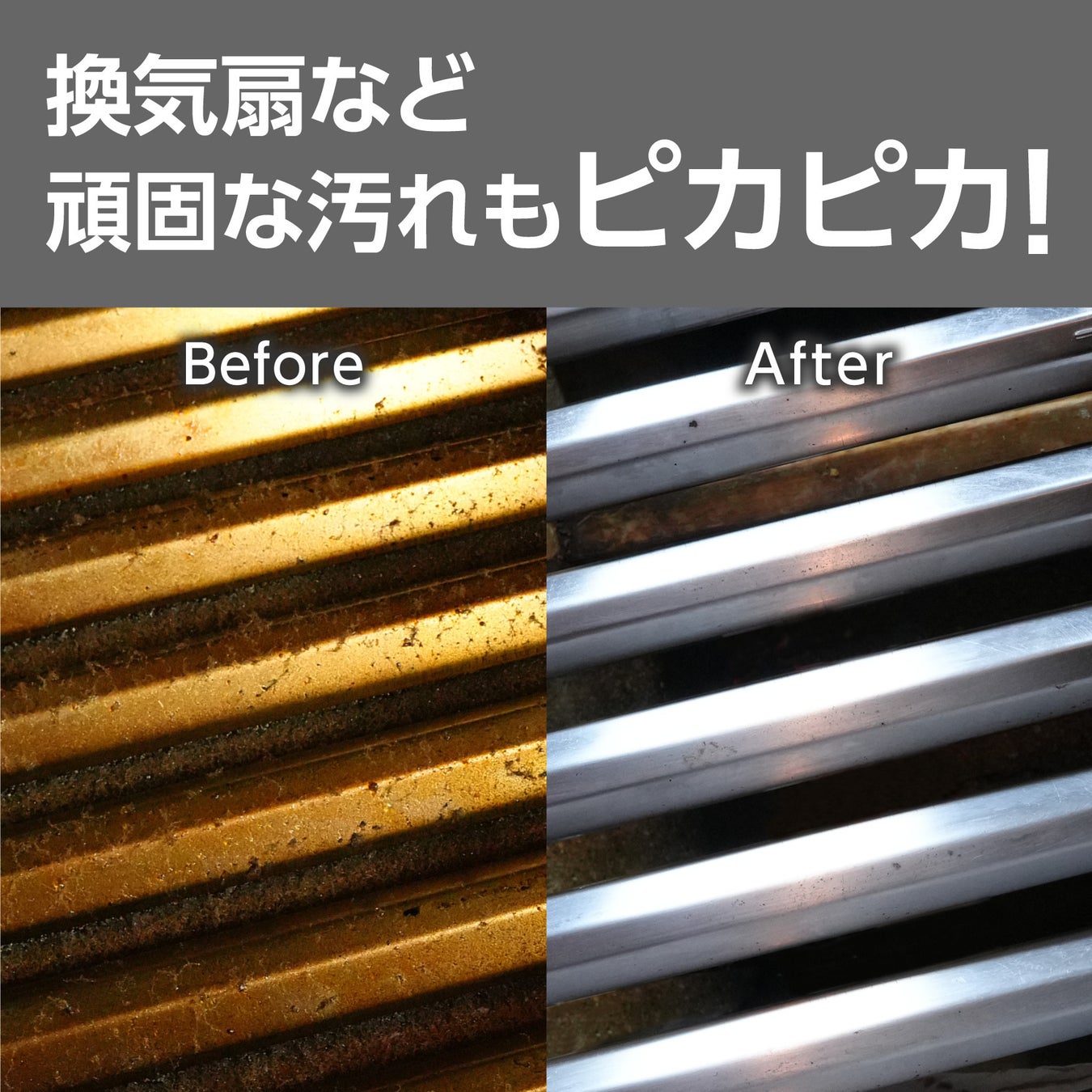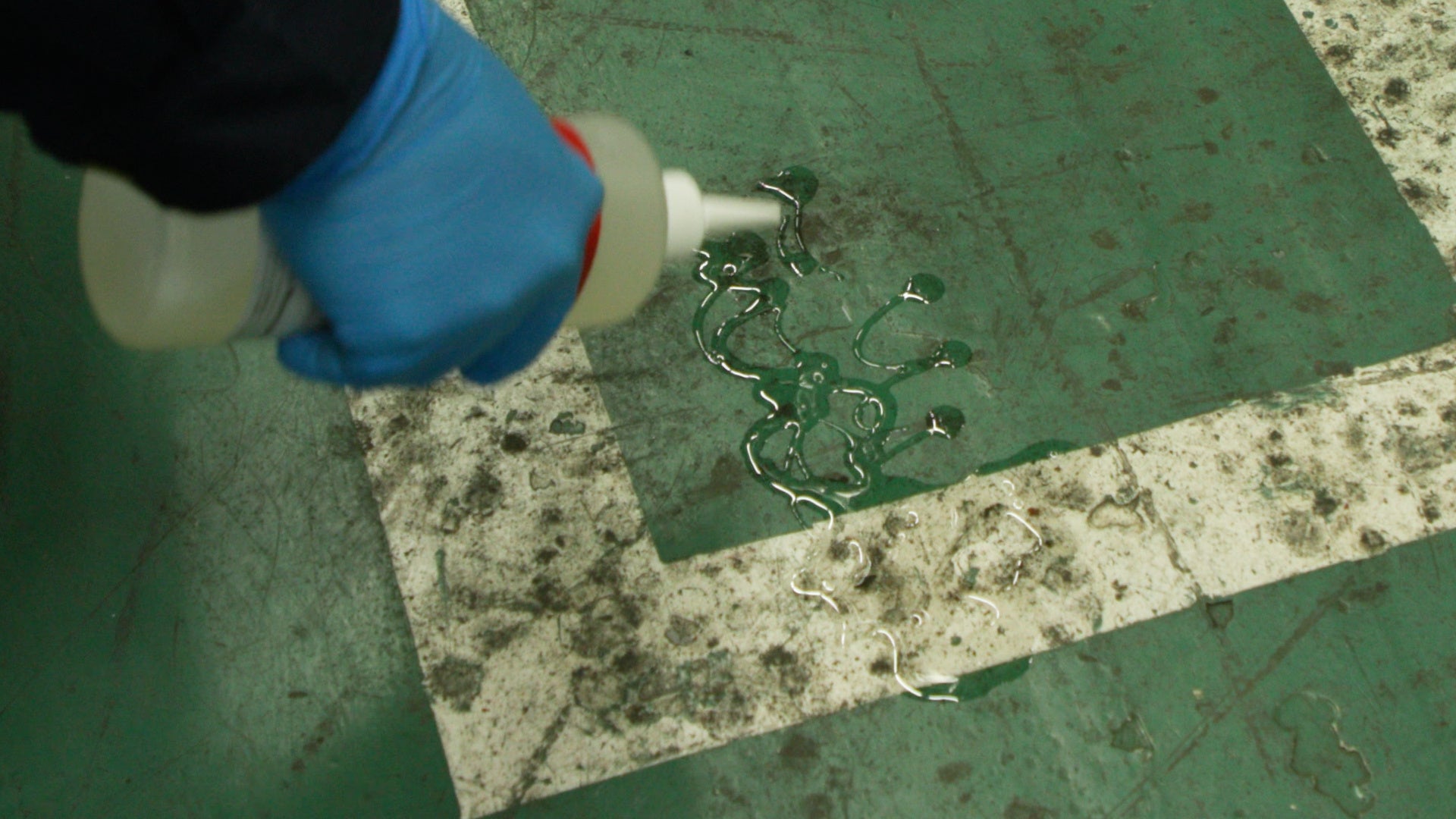 有効成分を50%以上配合したことにより、当社従来品の「油汚れ洗剤 工業用 強力タイプ」と比べて高い洗浄力を実現しました。特に、これまで落としにくかったグリス汚れや硬化油に対し、より高い洗浄力を発揮し、機械部品や厨房設備など、さまざまな現場の頑固な油汚れにお使いいただけます。また、強力な洗浄力により、少ない洗剤量と短い時間で油汚れを除去できるため、清掃作業の負担を軽減し、作業時間の短縮に貢献します。