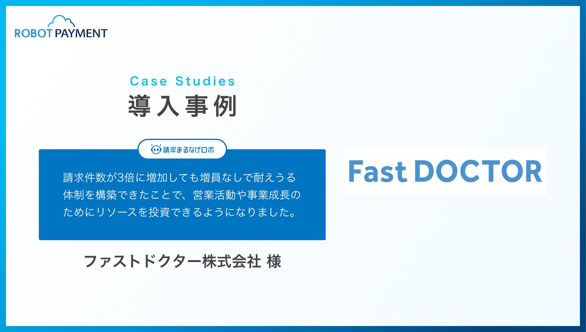 株式会社ROBOT PAYMENT(本社:東京都渋谷区、代表取締役:清久 健也、証券コード:4374、以下「ROBOT PAYMENT」)は、企業間請求代行サービス「請求まるなげロボ」が、ファストドクター株式会社の導入事例ページを公開したことをお知らせします。