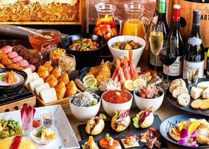 お好みの具材とかながわブランドこだわりの有精卵を使用したふわふわのオムレツは目の前で仕上げます。自家製パンも豊富にご用意しており、小涌園特製生食パンを使用したフレンチトーストも味わえます。和食では、香ばしく炙った地場の焼き立ての魚、板前がおすすめする炊き立てご飯に海の幸、山の幸をトッピングに用意したお好み山海丼など、和・洋バラエティに富み、選ぶ楽しさ満載のラインナップです。素材が持つ香り、色、味わいを活かして創りだされた料理で最高の時間を過ごしていただけます。