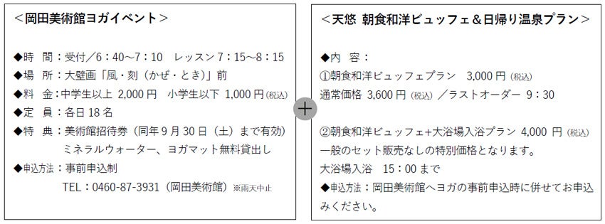 箱根小涌園 天悠(所在地:神奈川県足柄下郡箱根二ノ平1297、支配人:柴田 訓)は、近隣にある岡田美術館(館長:小林 忠)で開催のヨガイベントと天悠の朝食と温泉が楽しめるプランをご用意しました。