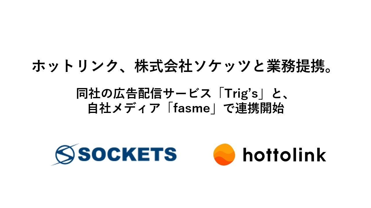 SNSマーケティング支援サービスを提供する株式会社ホットリンク(本社:東京都千代田区、証券コード:3680、代表取締役グループCEO:内山幸樹、以下ホットリンク)は、株式会社ソケッツ(本社:東京都渋谷区、代表取締役社長:浦部浩司、以下ソケッツ)と業務提携を行い、同社が提供する広告配信サービス「Trig’s(トリグス)」との連携を、自社メディア「fasme(ファスミー)」にて開始することをお知らせいたします。