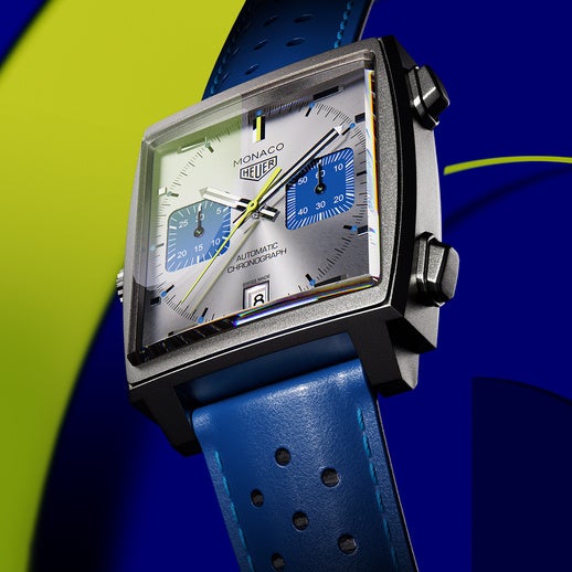 時針と分針にはブルーのスーパールミノバ®を塗布、どのような明るさでも優れた視認性を発揮します。ライムイエローのラッカーで仕上げた秒針がこれを引き立て、ポップなカラーを添えます。こうしたデザイン要素を重ねることで、「タグ・ホイヤー モナコ クロノグラフ レーシングブルー」は調和の取れた姿に、そして自動車の世界観を捉えた魅力あふれるタイムピースとなりました。