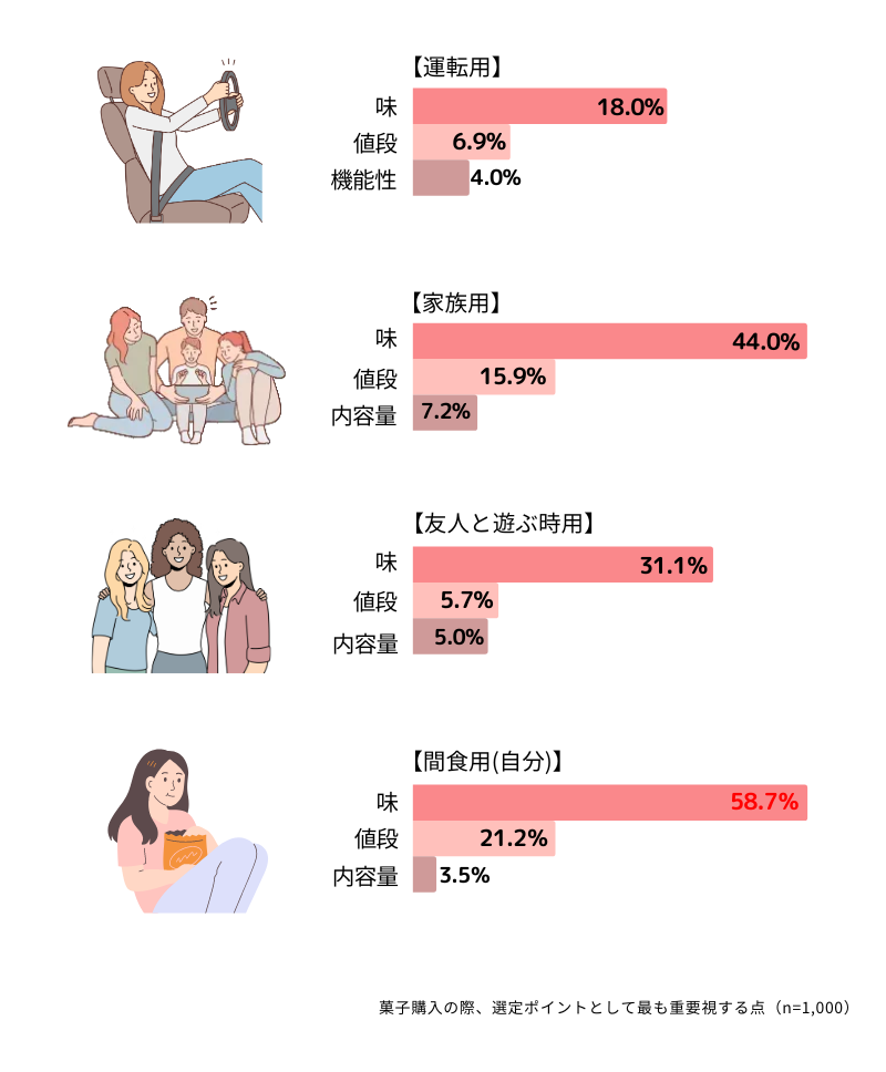 さらに、自分で楽しむためのお菓子(「自分へのご褒美」「間食用(自分)」)には特に「味」にこだわりを持っていることがわかりました。