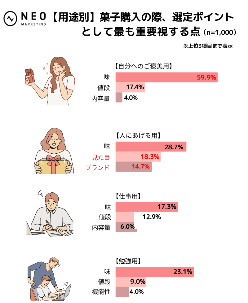 一方、最も選定ポイントに大きな違いがあったのが「人にあげる」場合で、味の次に気にするポイントが値段ではなく「見た目」となっています。