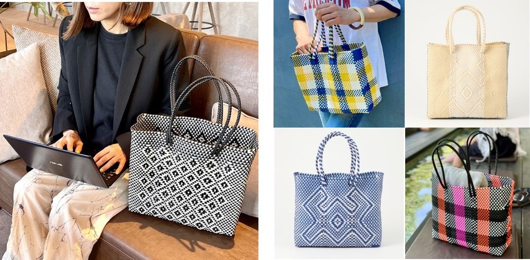 メキシコの工芸品であるメルカドバッグはペットボトルのキャップなどをリサイクルした素材を用いて、熟練した職人の手で1点ずつ手編みで作られています。メキシコらしいインパクトのある、大人っぽいサマーデザインが特徴です。リサイクル素材を用い、ハンドメイドで作られているため、一点ずつ色や柄の出方に個性があります。また、軽くて丈夫なのが夏に嬉しいポイント。汚れにくく、汚れてもすぐふき取ることができます。水に濡れてもシミにならないので通勤や旅行時、アウトドアやジムなど、さまざまなシーンに活用できます。また、和装とのコーディネイトにもおすすめです。
