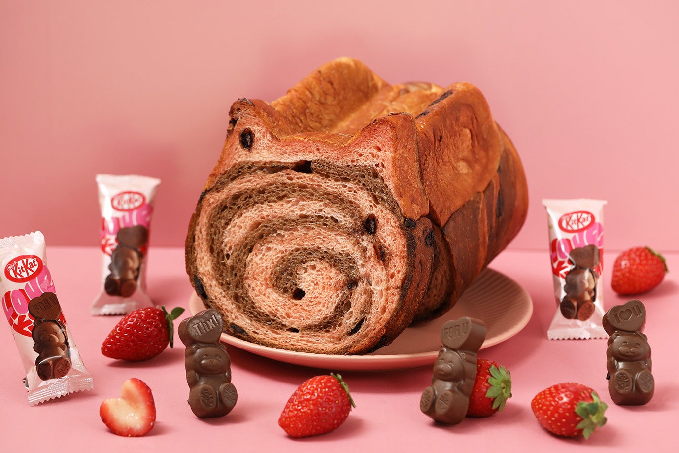「キットカット ハートフルベアー」をイメージした、バレタインシーズン限定のねこねこ食パン。「キットカット ハートフルベアー」のパッケージカラーをイメージしたいちごチョコ入りのいちご風味の生地に、チョコチップを練り込んだチョコ生地を重ねています。ピンク色の耳が可愛らしさを引き立てます。