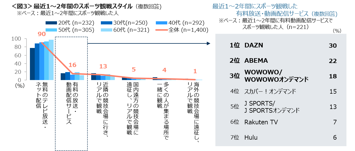 観戦経験のある人のうち9割が、「無料のテレビ放送・ネット配信」で観戦をしていた。「有料の放送・動画配信サービス」での観戦は16%、競技会場へ行って観る「リアル観戦」が13%と続く。有料の放送・動画配信サービスは「DAZN」「ABEMA」「WOWOWO/WOWOWOオンデマンド」が多い。<図3>