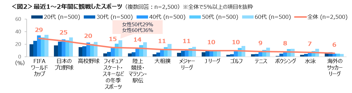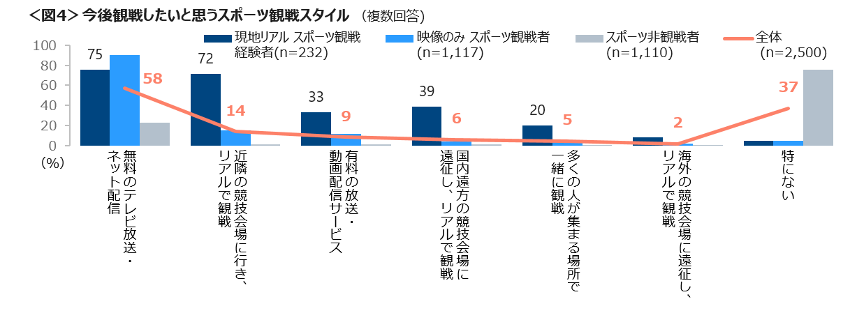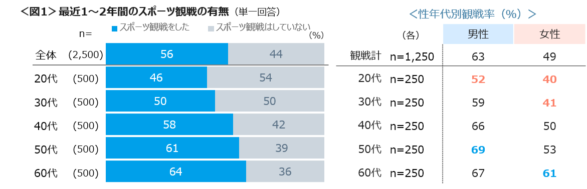 スポーツ観戦を楽しむ人は56% 中高年で高い 2年以内に会場で観戦した人は、今後もリアル観戦意向が強い