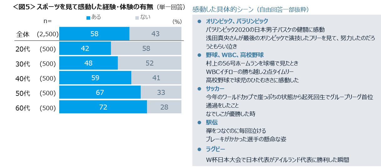 スポーツを観戦し感動した経験のある人は58%、年代が高いほど割合が高まる傾向であり、60代は72%を占めた。具体的には、オリンピック、プロ野球、WBC、高校野球、サッカー、駅伝、ラグビーなど、様々な感動シーンの声が聞かれた。<図5>