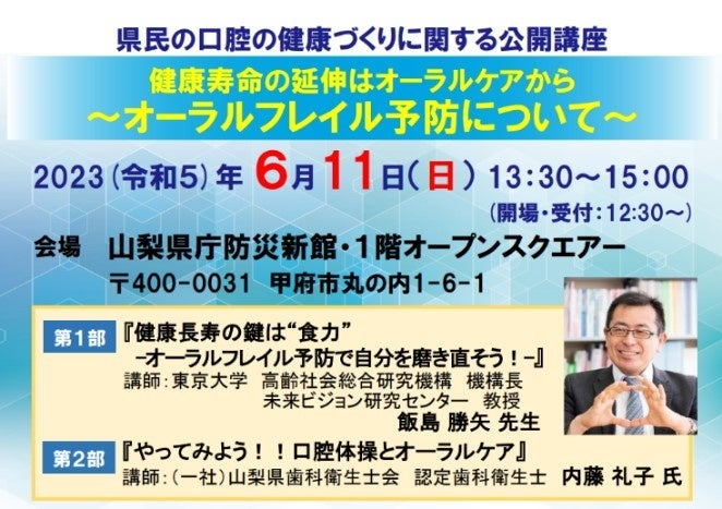 当日は、東京大学 高齢社会総合研究機構 機構長 未来ビジョン研究センター教授 飯島勝矢先生、山梨県歯科衛 生士会の認定歯科衛生士内藤礼子氏から、なぜ今「オーラルフレイル予防」が必要なのか、そしてオーラルフレイル予 防に役立つオーラルケアの知識について、わかりやすく、実践的にお伝えします。