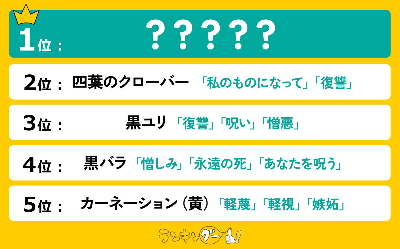 1位は「あなたの死を望みます」という花言葉をもつスノードロップに決定!2位は「私のものになって」「復讐」という花言葉をもつ四葉のクローバー。3位は「復讐」「呪い」「憎悪」という花言葉をもつ黒ユリ。4位は「憎しみ」「永遠の死」「あなたを呪う」という花言葉をもつ黒バラ。そして、5位にランクインしたのは、「軽蔑」「軽視」「嫉妬」 という花言葉をもつカーネーション(黄)という結果となりました!