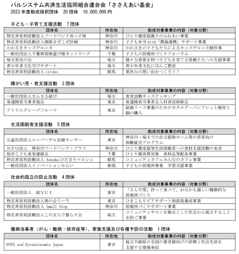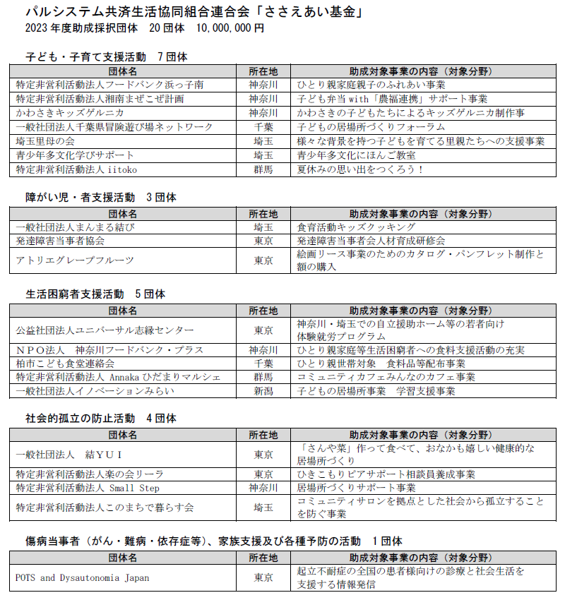 「ささえあい基金」は、生活困窮者や障がい者、社会的孤立の防止などへの支援活動に取り組む市民団体やNPO団体への助成金制度です。「互いに支え合える地域社会づくりに寄与すること」を目指し2021年度に創設しました。助成金はCO・OP共済《たすけあい》の剰余金の一部が活用されます。本年度は、20団体へ1,000万円を助成します。
