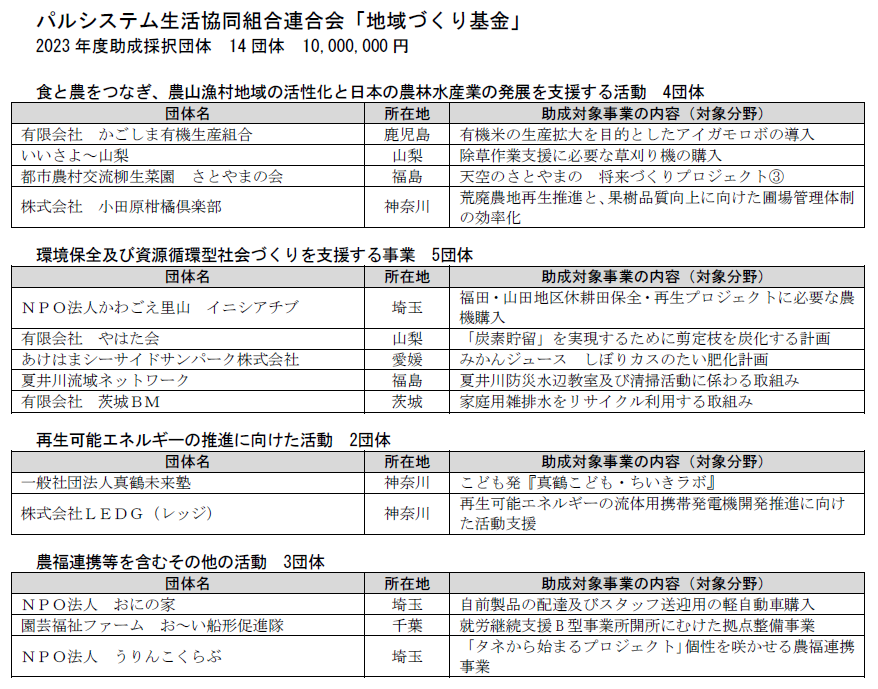 会員生協:パルシステム東京、パルシステム神奈川、パルシステム千葉、パルシステム埼玉、パルシステム茨城 栃木、パルシステム山梨 長野、パルシステム群馬、パルシステム福島、パルシステム静岡、パルシステム新潟ときめき、パルシステム共済連、埼玉県勤労者生協、あいコープみやぎ