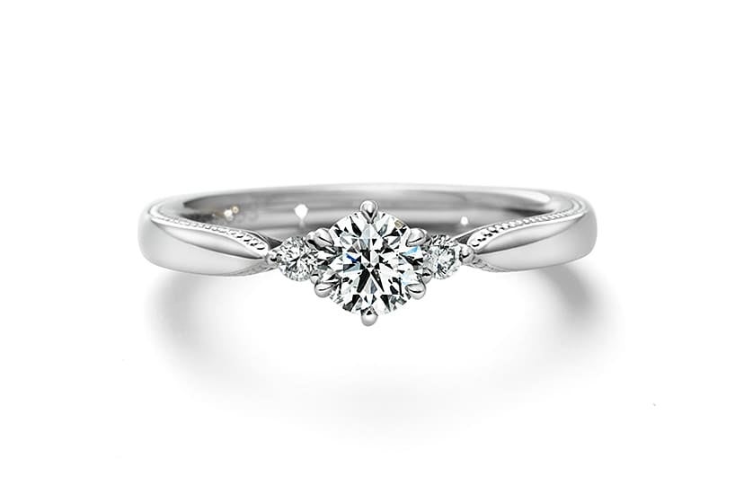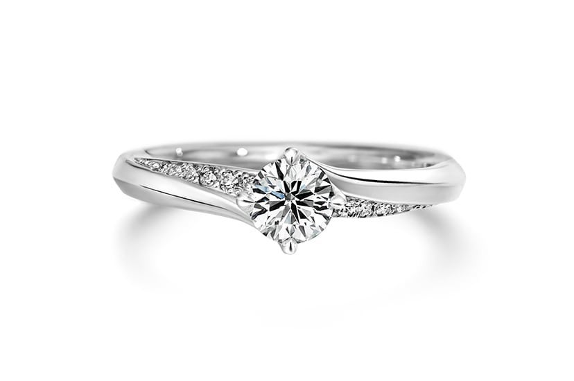 引き寄せる幸運を表現したエンゲージリング。二人が運命的に惹かれたダイヤモンドの両サイドに流れるプラチナの光がより一層輝きを美しく魅せます。