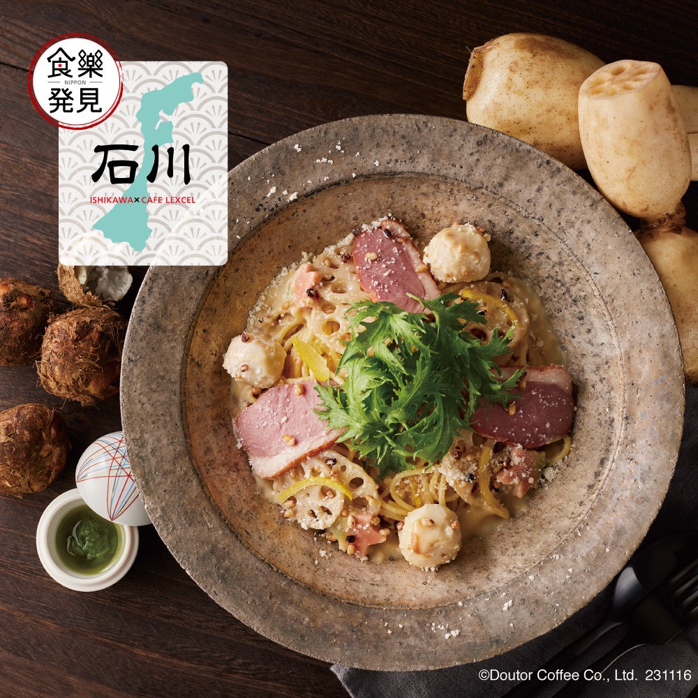 石川県の郷土料理「治部煮(じぶに)」をイメージしたごちそうパスタ。治部煮の具材に用いられる鴨肉、蓮根、里芋に、石川県に根付く「発酵食文化」にも着目し、豆乳に発酵調味料の醤油糀と金沢白糀を合わせた特製発酵クリーミーソースで仕立てました。玄米あられ、ゆず、わさび菜、生もみじ麩をトッピングし、食感と風味、地域色をプラス。「治部煮」の薬味で添えられるわさびの味わいを楽しめる「茎わさびオイル」をかけて、味の変化も楽しめます。石川県の冬の季節のおもてなし料理と食文化を楽しめるこだわりの一皿です。