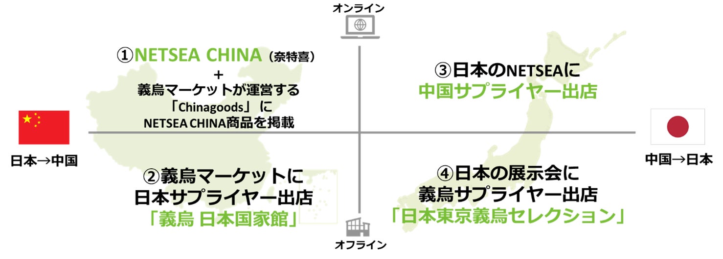 現在、具体的な取り組みとして日中間の輸出入をオンライン・オフラインで繋ぐ4つの施策を進めています。