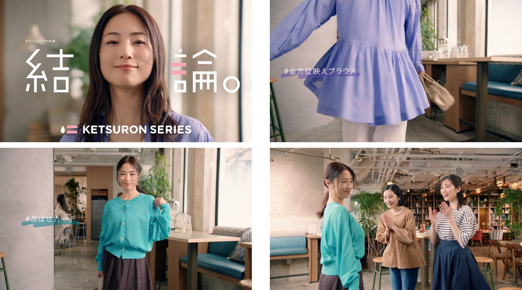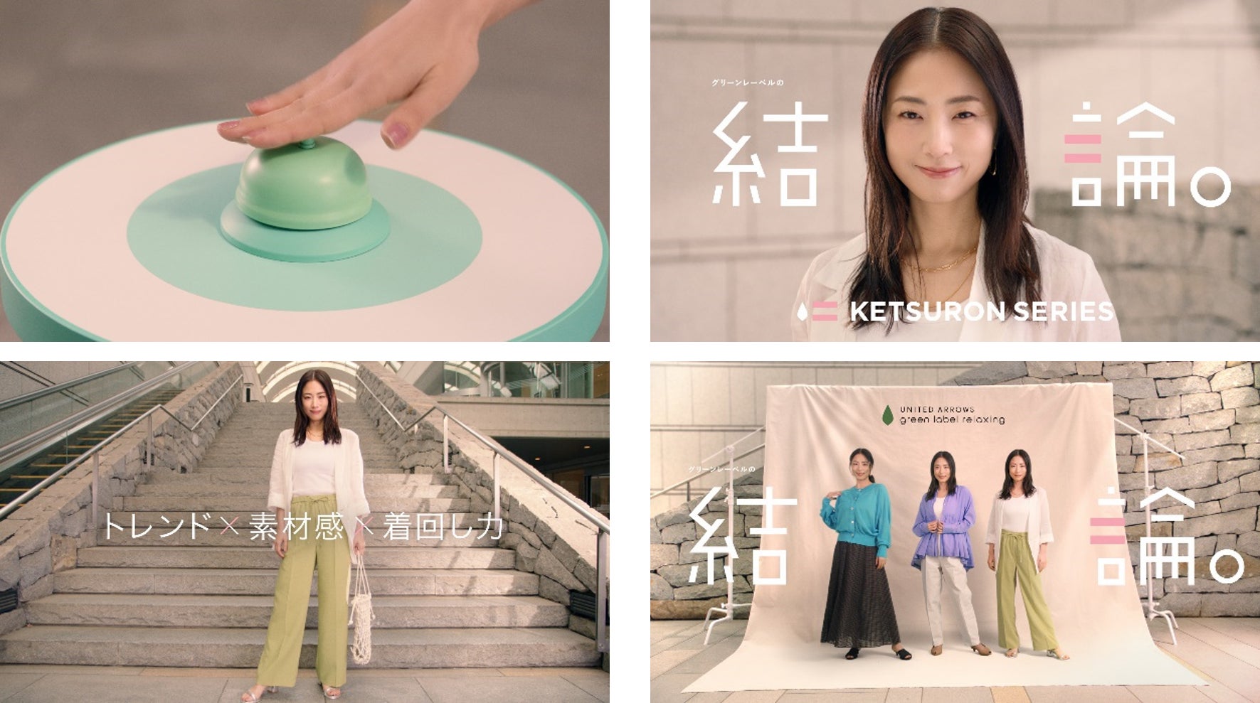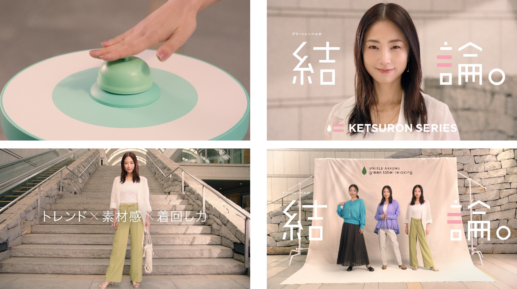 CMタレントには、お客様の背中を押すことができる存在として、凛としたたたずまいと正直な発言が印象的なMEGUMIさんを起用。街角でファッションに関する悩みや憧れに思いを馳せる女性たちの前に「結論シリーズ」のアイテムを着用したMEGUMIさんが登場すると、“グリーンベル”を鳴らし、自信あふれる表情で「グリーンレーベルの結論。」を提案します。