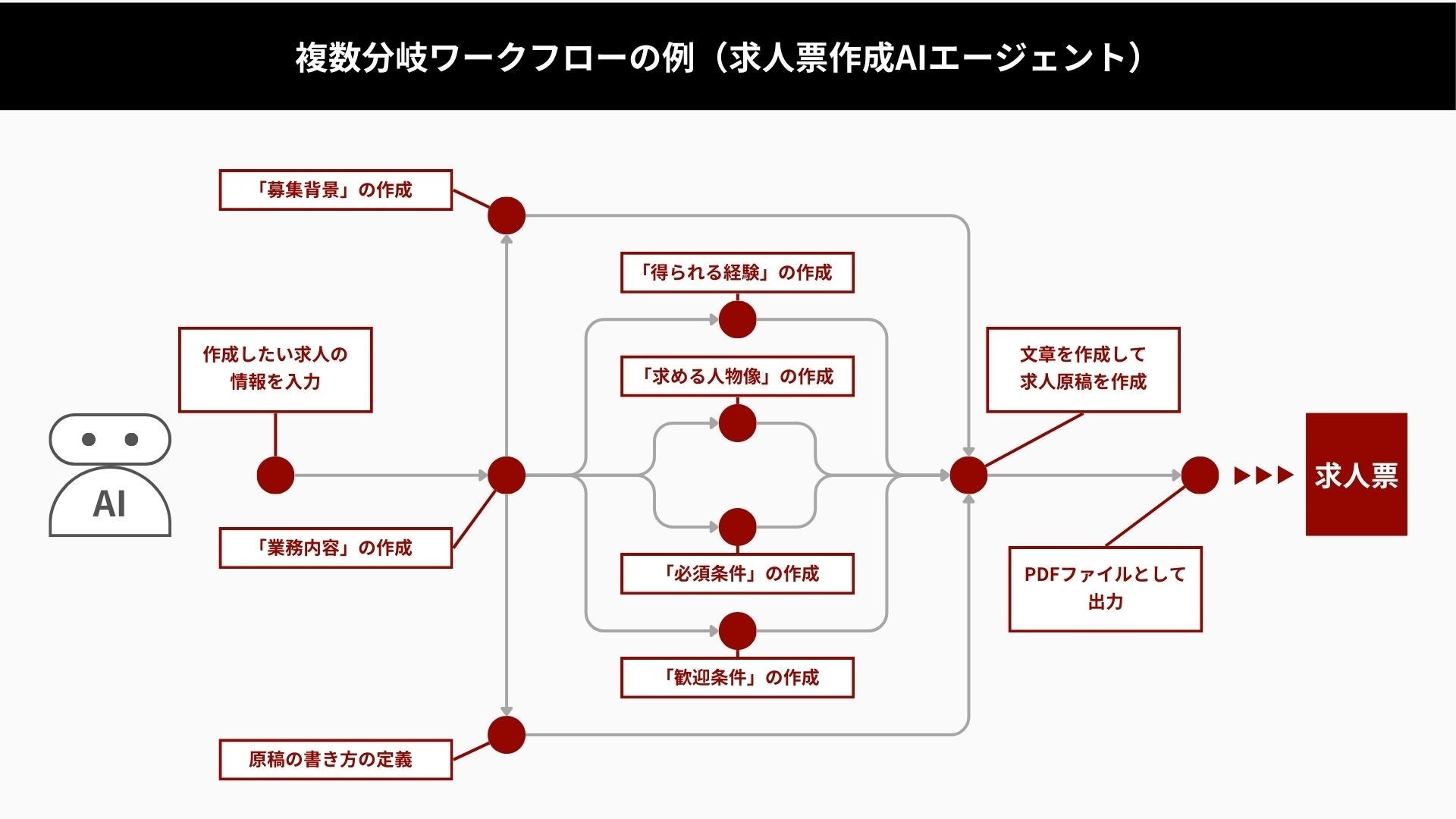 ワークフローは分岐させることが可能で、適切なワークフローを組むことで、より複雑なタスクの遂行や精度の高いアウトプットが可能になります。