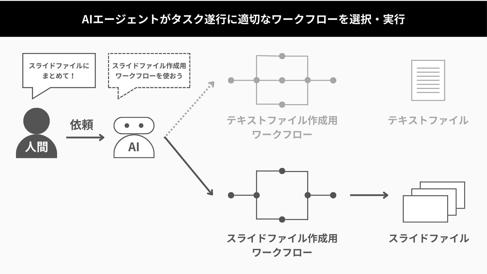 「JAPAN AI AGENT」は「複数の選択肢から自律的に判断して選択すること」が可能であるため、例えば複数のワークフローを設定したAIエージェントを作成した場合、人間からの指示に適したワークフローを自身で判断し、タスクを遂行することができます。