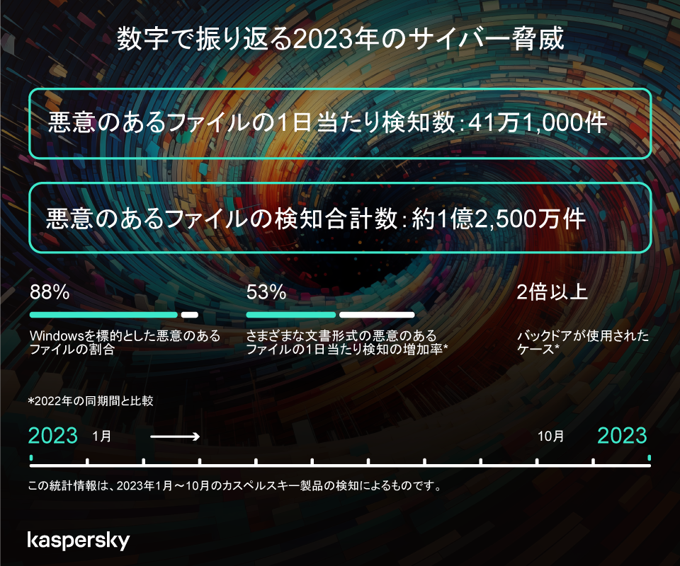 2023年1月から10月までの10カ月でカスペルスキー製品が検知した悪意のあるファイルは1日当たり平均41万1,000件に上り、前年同期間比で3%の増加が明らかになりました。また、特定の種類の脅威も増加しており、Microsoft OfficeやPDFほか悪意のあるドキュメントを用いた攻撃が53%と著しく増加しました。手口としては、バックドアを利用して検知されずにシステムに侵入するといった、より危険な手口を用いる傾向が見られました。