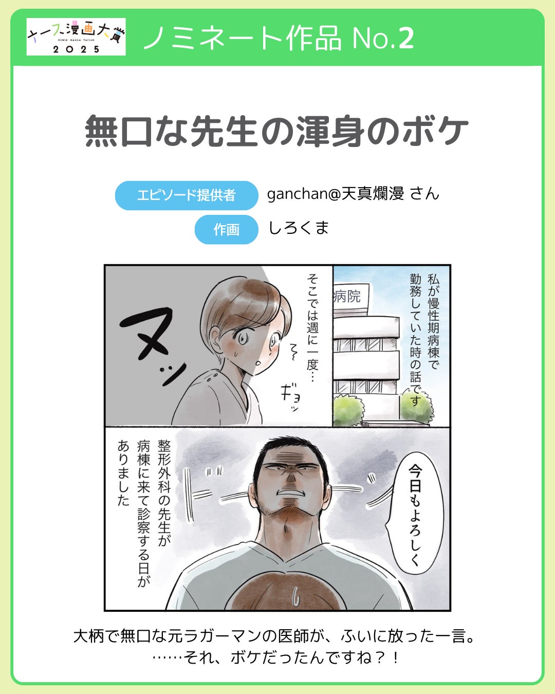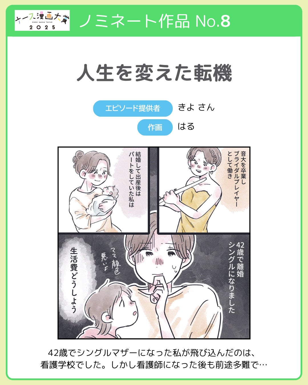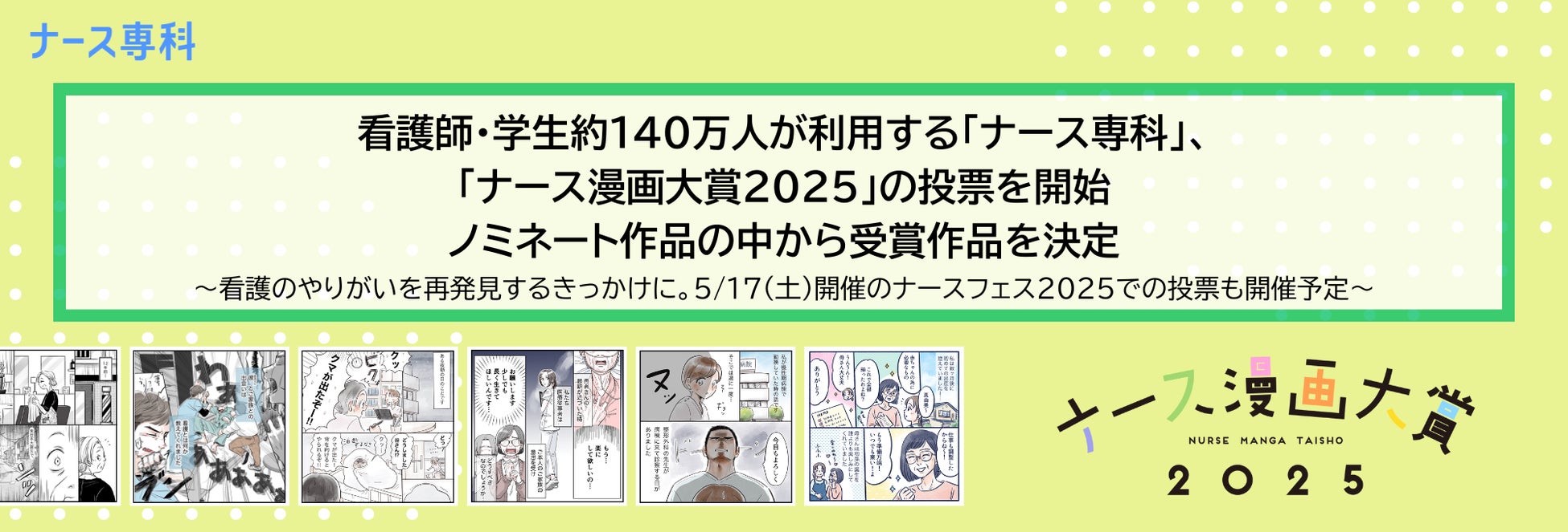 株式会社エス・エム・エス(本社:東京都港区、代表取締役社長:後藤夏樹、東証プライム、以下「当社」)は、提供する看護師・看護学生向けコミュニティ「ナース専科」(URL:https://media.nurse-senka.jp/)において、過去1年間で掲載したナース漫画の中から投票で受賞作品を決める「ナース漫画大賞」のノミネート作品への投票を開始したことをお知らせします。以下特設サイトのほか、5月17日(土)・18日(日)に渋谷ヒカリエで開催予定のナースフェス2025の会場内でも投票が可能です。