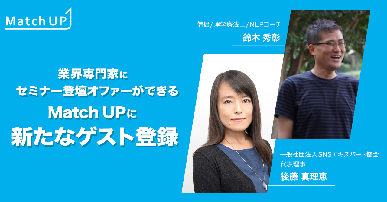 業界専門家にセミナー/イベント登壇のオファーができる「Match UP」一般社団法人SNSエキスパート協会 後藤 真理恵氏、僧侶/理学療法士/NLPコーチ 鈴木 秀彰氏などが新たにゲスト登録!