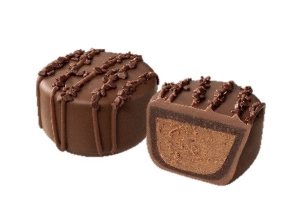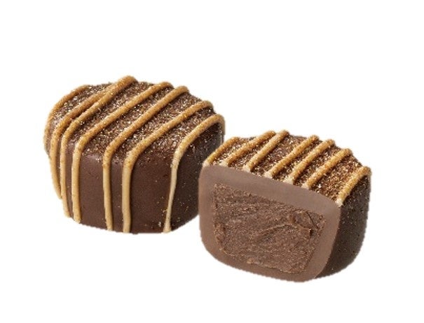 ほどよいコクとキャラメルライクな味わいのブロンズチョコレートガナッシュをミルクチョコレートで包み、キャラメルフレーバーのラインチョコレートで飾りました。濃厚で香ばしいひと粒です。