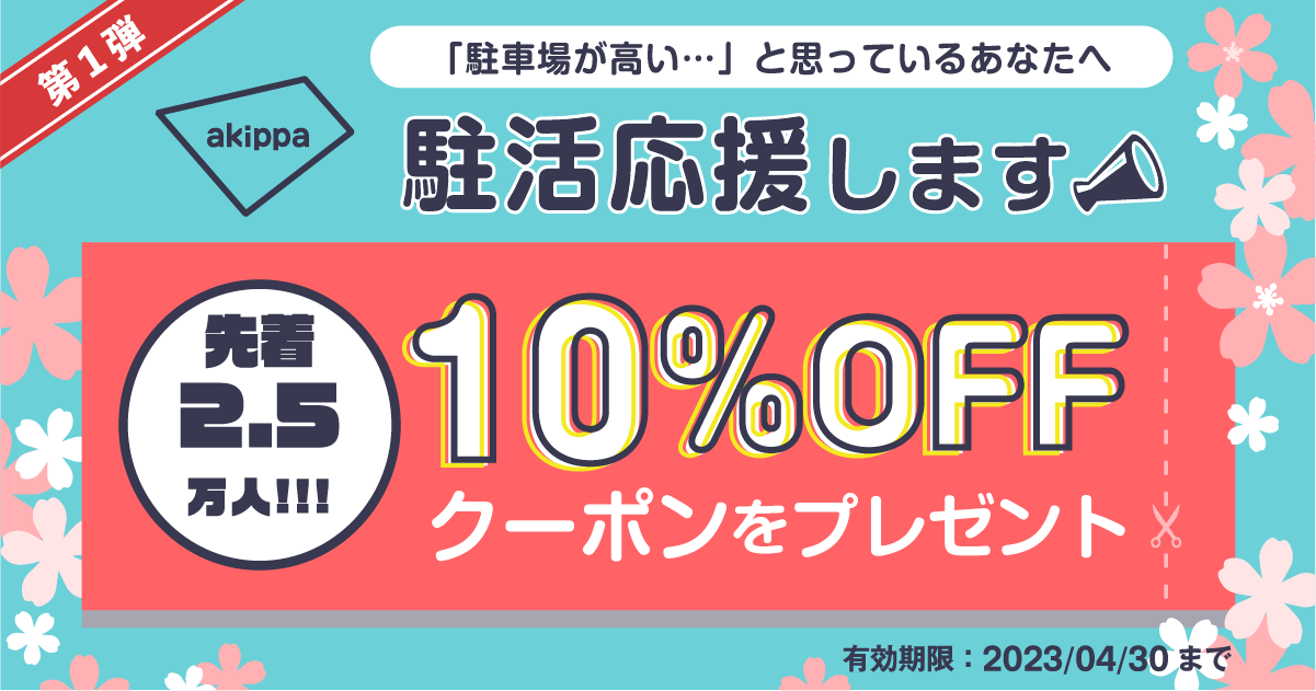駐車場予約アプリ「akippa」(あきっぱ)を運営するakippa株式会社(代表取締役社長 CEO:金谷元気)は「せめて駐車場は安く使いたい春の駐活応援キャンペーン」を本日2023年3月1日(水)より開始することをお知らせします。キャンペーンは2回に分けて実施予定となっており、第1弾は先着25,000名様にakippaの割引クーポンを配布いたします。