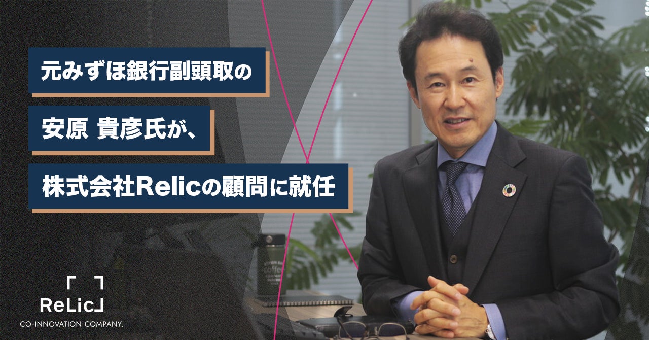 事業共創カンパニーである株式会社Relic(本社:東京都渋谷区、代表取締役CEO 北嶋 貴朗、以下「Relic」)は、2025年7月より、国内外の新規事業支援およびオープンイノベーションのさらなる推進に向けて、元みずほ銀行副頭取の安原 貴彦氏を顧問として迎えました。安原氏の多様なネットワークと幅広い経営知見を活かし、Relicが描く中長期的な成長戦略や、企業間連携、資本戦略における外部支援体制を強化してまいります。