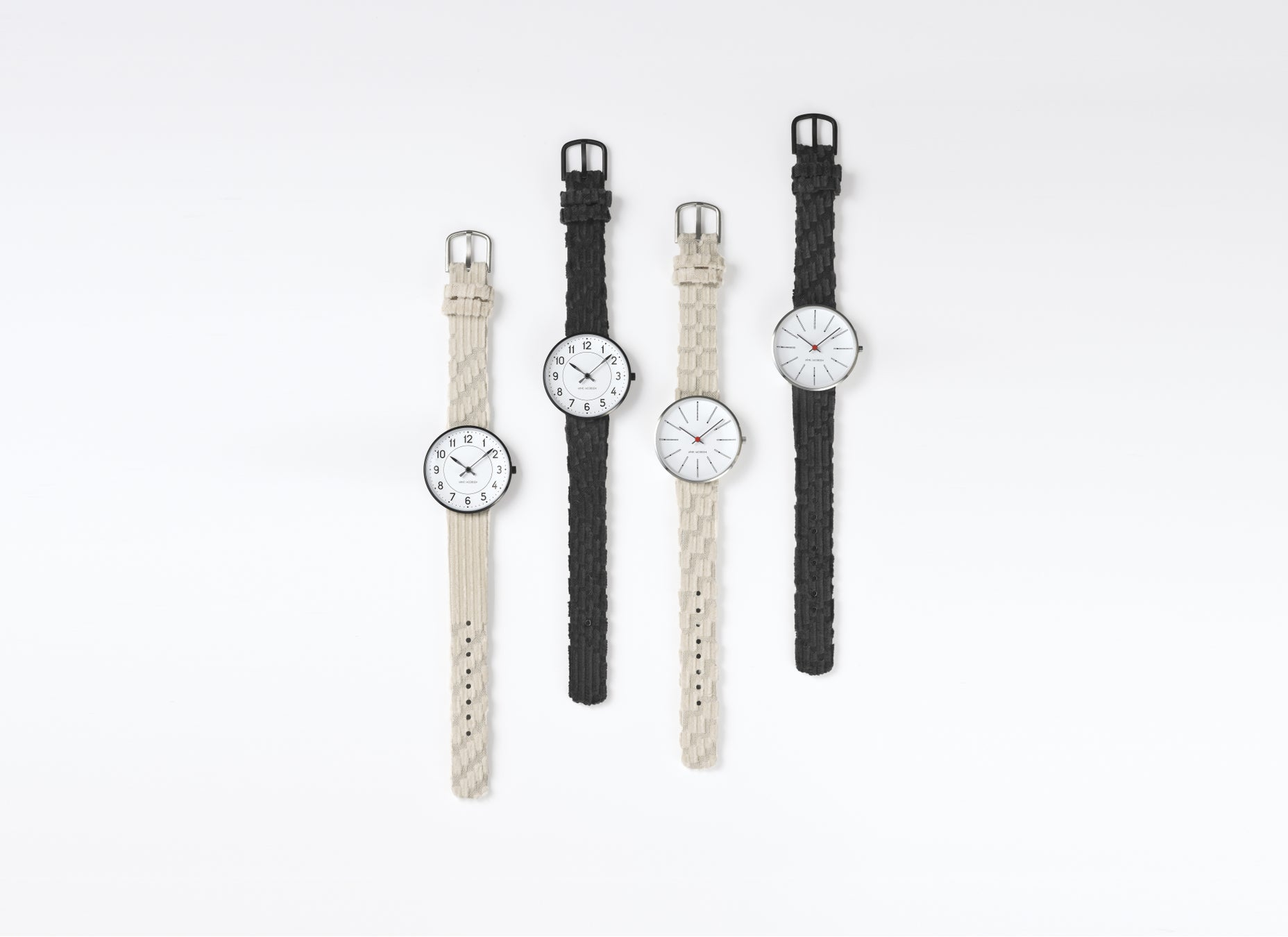 ヤコブセンがデンマーク国立銀行を手がけた際にデザインされた“BANKERS”、デンマークの駅に採用されている“STATION ”のデザインが、minä perhonen の “land puzzle” のベルトを纏った腕時計となりました。