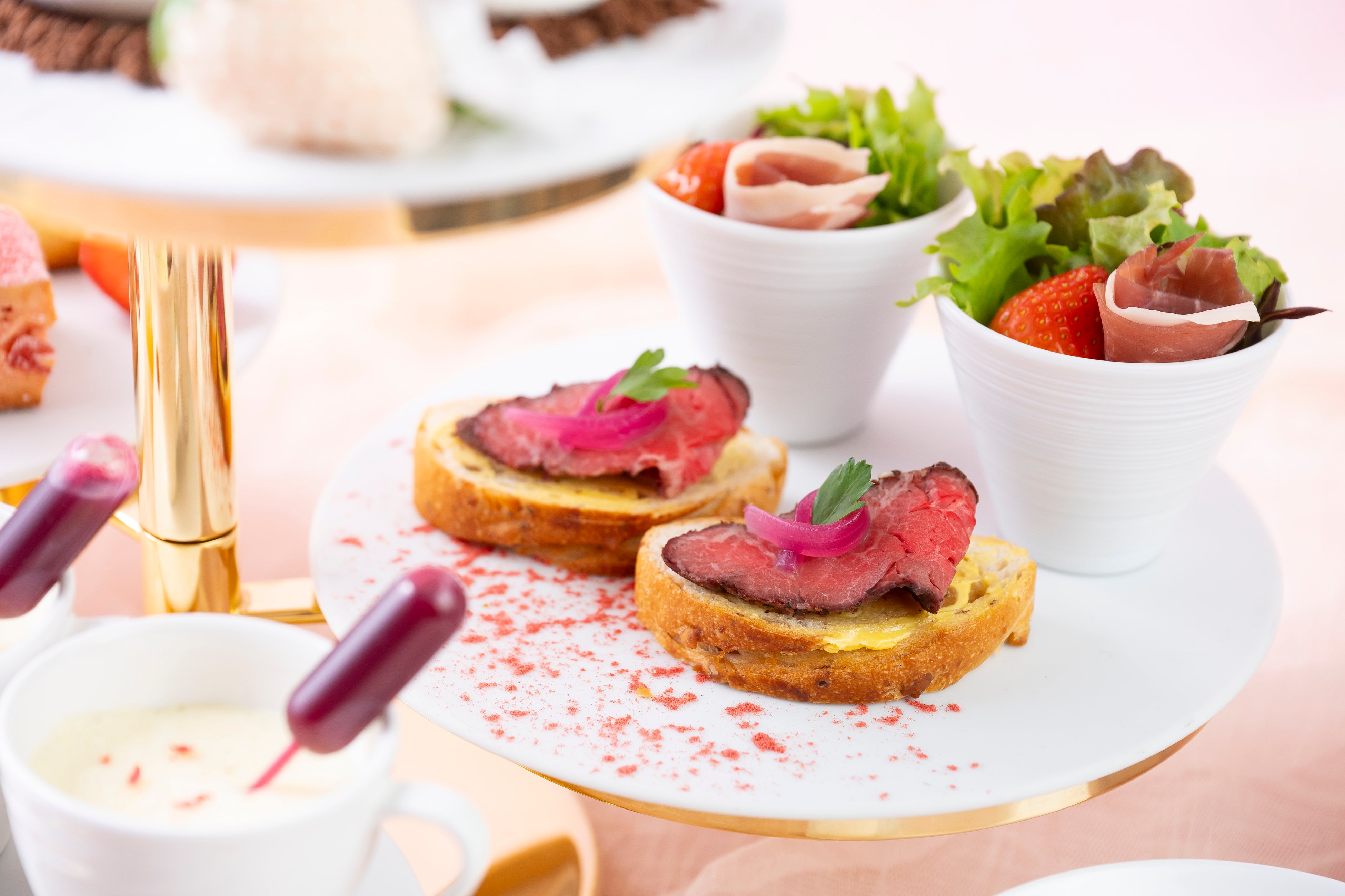 セイボリーには、野に咲くいちごをイメージした「いちご畑コーン」や、香ばしく焼き上げたクルミパンにローストビーフを重ね、レッドオニオンのピクルスをアクセントに添えた「ローストビーフオープンサンド」をラインナップ。