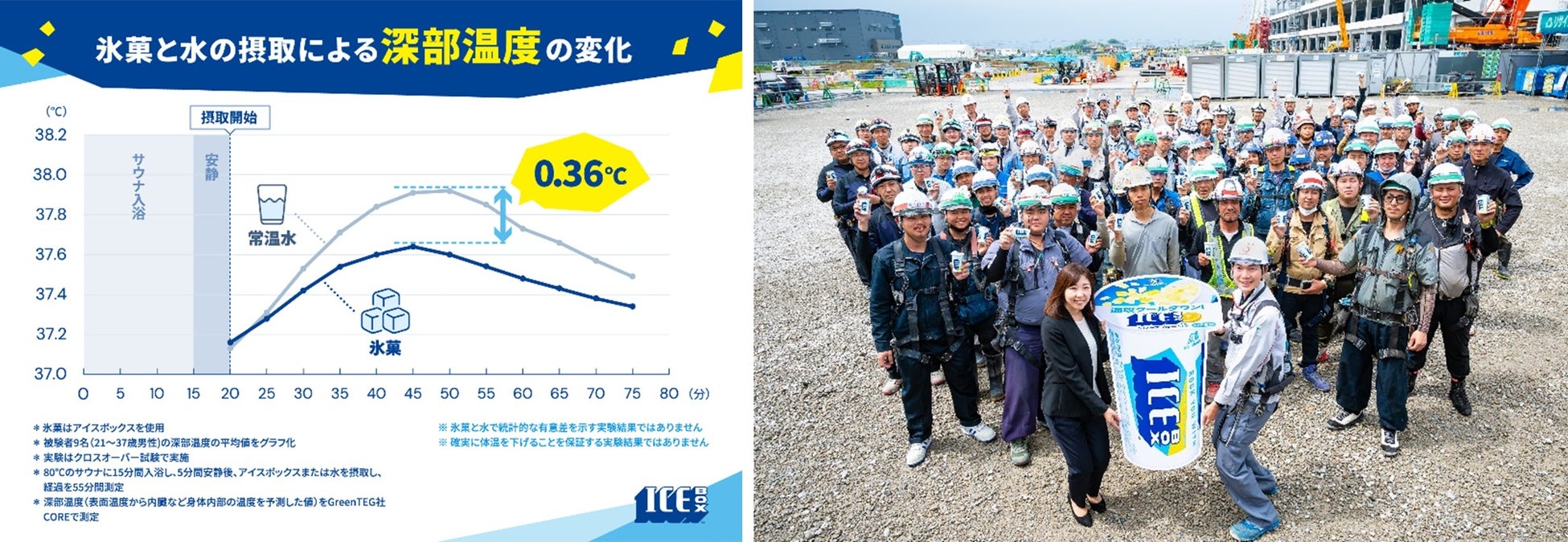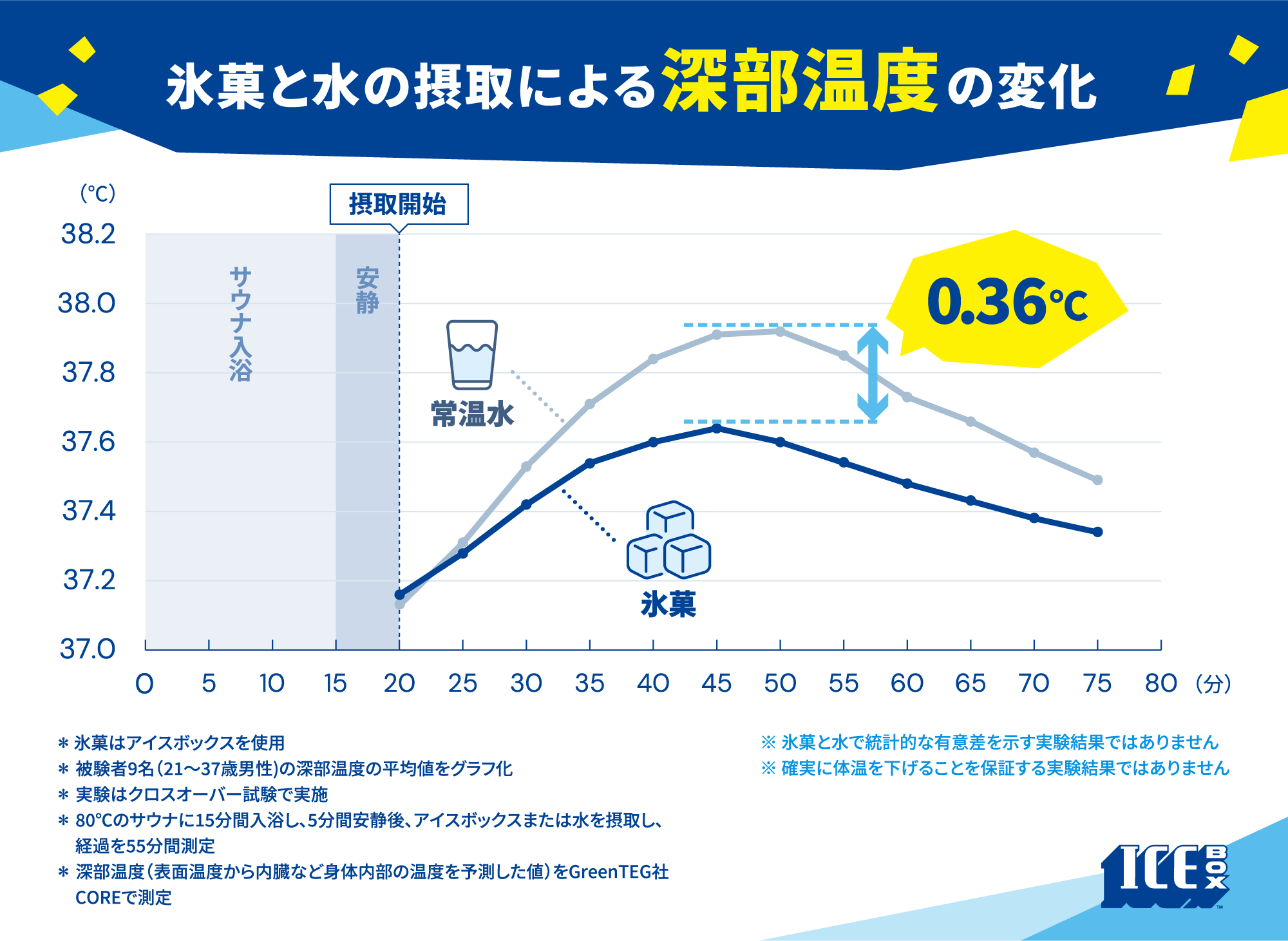 年々暑さが増している夏。暑さ対策には「水分補給」と「塩分補給」に加えて、実は「クールダウン」することも重要です。一般的に氷は水と比較し、体から奪う熱量が4倍であると言われています。今回の「アイスボックスを使用した深部温度の実証実験」では、サウナ入浴後に常温水を飲んだ場合と氷菓を喫食した場合の深部温度の変化を比較しました。その結果、0.36℃差が生じました。