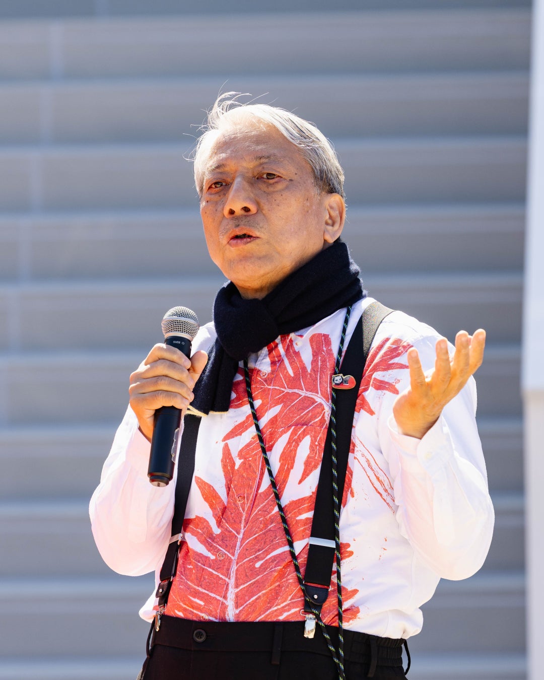穏やかな青空が広がる中、高さ約4メートルの「シップス・キャット」像をバックに行われたオープニングセレモニーでは、始めに館長の後藤が挨拶しました。