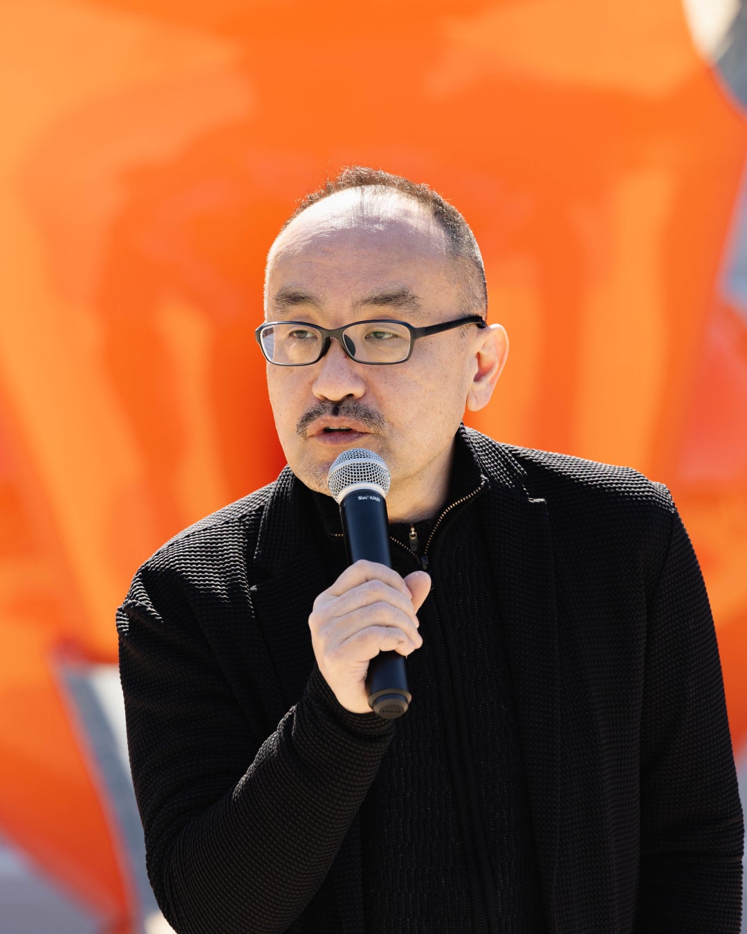 続いてヤノベケンジは「この豊かな自然の中で何か芸術を見せるとなったときに、やはり宮沢湖の存在が気になりました。じっと見ていると幻影のように、巨大な猫が島の上に眠っている姿のイマジネーションが降りてきたのです。銀座のど真ん中で展覧会をさせてもらっていますが、都心とは違った場所で何ができるかと不安もある中、猫島が設置された風景を見たら、一年前に自分が見た幻影が形になったことに感動しています。ボートを使って湖に浮かぶ美術館の島へ渡るという体験ができるのは、世界に類をみないのではないか」と話しました。