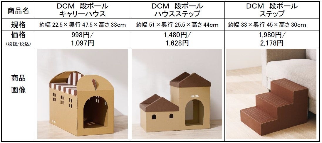 全国でホームセンター事業、EC事業等を展開するDCMホールディングス株式会社(東京都品川区、代表取締役社長兼COO:石黒靖規、以下「DCM」)は、軽くてリサイクル可能な段ボール製でしっかりとした強度を確保した3種類のペットハウスとペットステップを、2025年1月24日(金)より全国のDCM店舗(一部店舗を除く)にて新発売します。