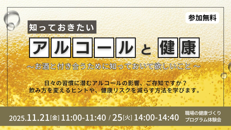 株式会社ルネサンス(本社:東京都墨田区、代表取締役社長執行役員:望月 美佐緒、以下「当社」)は、企業及び健康保険組合向けに、従業員の健康管理と職場環境の改善を目的としたセミナー「知っておきたいアルコールと健康~お酒と付き合うために知っておいて欲しいこと~」の提供を2025年11月4日(火)から開始しました。