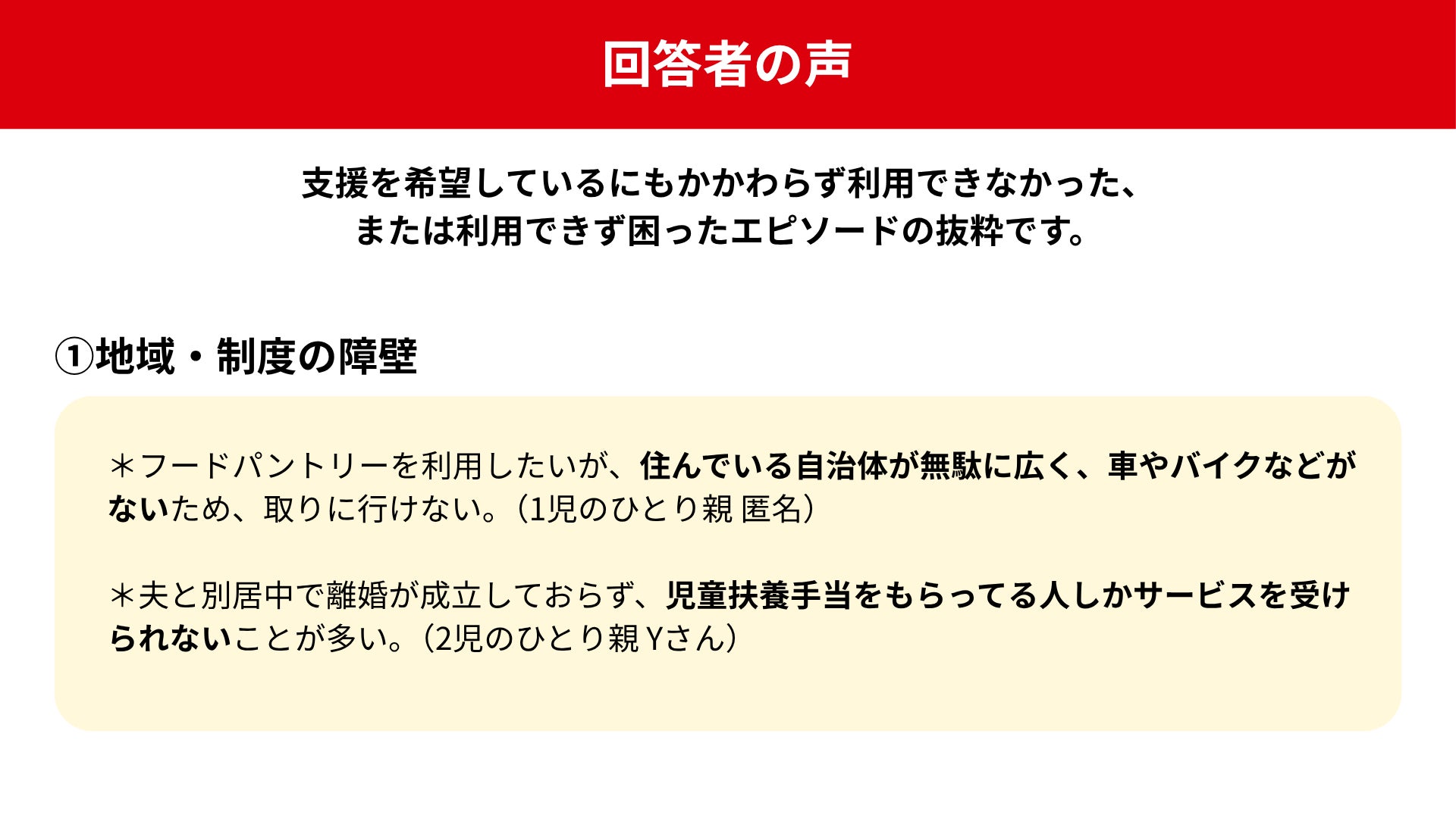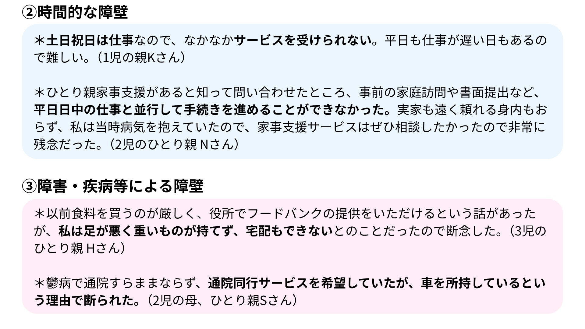アンケート結果・利用者の声から、既存の支援制度の網の目からこぼれ落ち、孤独・孤立を深めている親子の実態が浮き彫りになりました。物理的な障壁によって支援へのアクセスを諦めざるを得ない背景があり、こどもの健やかな育ちを脅かすリスクの高い状況を生み出しています。