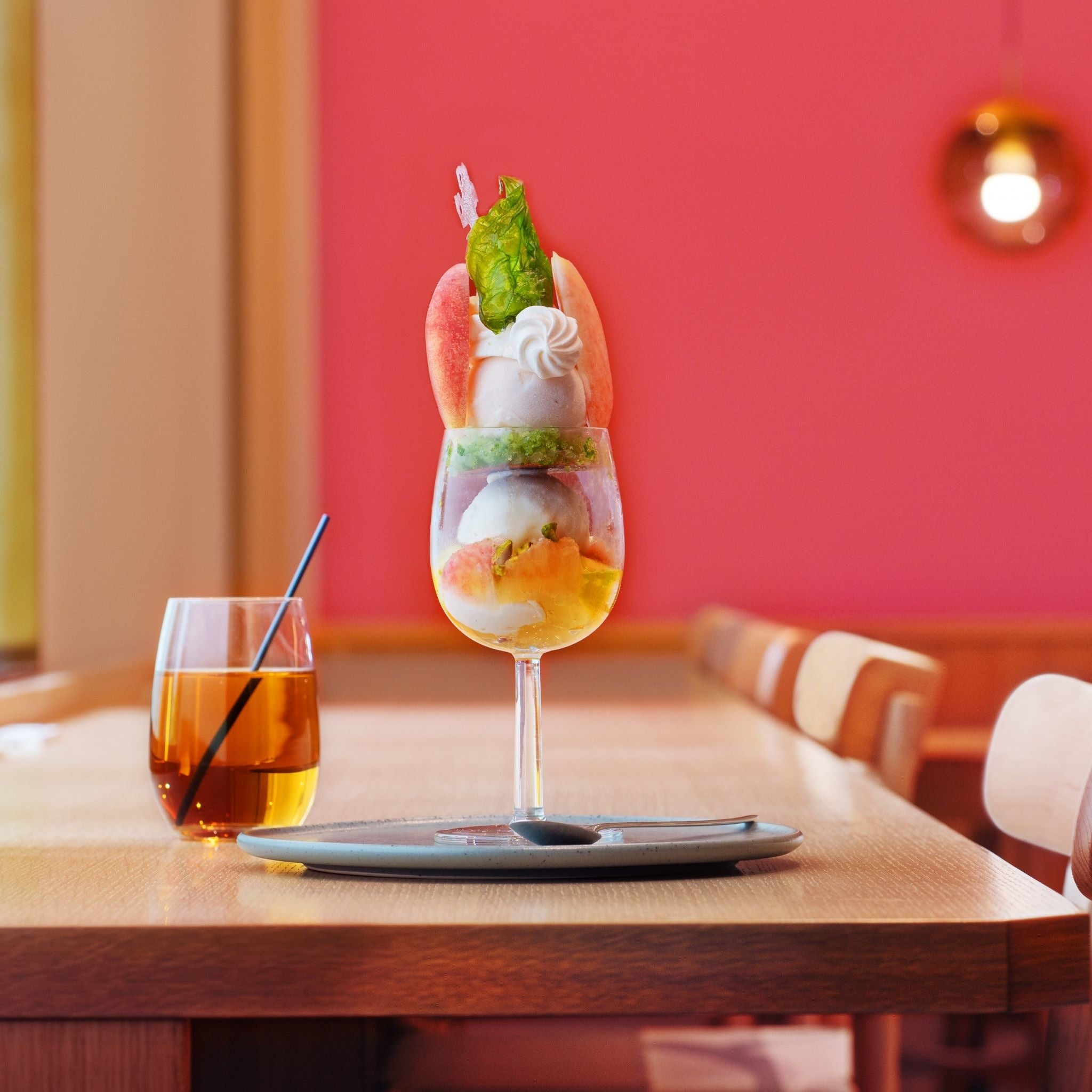 桃のバフェは、白桃のソルベとフロマージュブランのジェラートを主軸にし、グレープフ ルーツとバジルのグラニテを添えて爽やかな味わいに 。ジャスミンの香りも加わり、オリエンタルな余韻を感じさせてくれます 。焼き菓⼦は、新作のサブレシトロンと⼤⼈気のフロランタンを、⾷べやすいサイズにカットしてご提供。ドリンクは、オリジナルブレンドコーヒー、紅茶、ほうじ茶、ハーブティー、フルーツティーの中からお好きなドリンクをお選びいただけます。