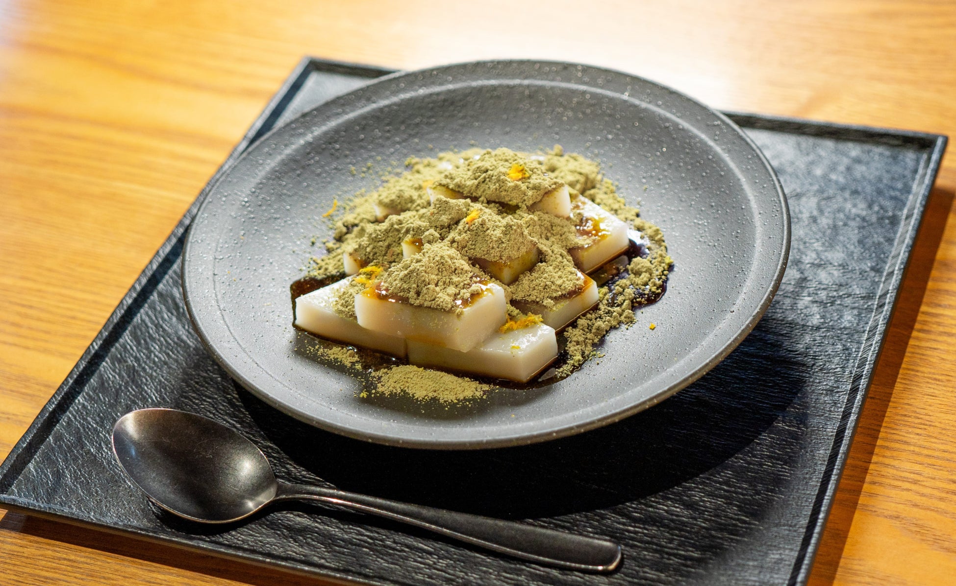 くず餅は、小麦でんぷんを450日間かけて乳酸菌発酵させた、もっちりとした独自の食感。通常は黒蜜ときな粉で提供していますが、本商品では宇治抹茶を使用した香り豊かな抹茶きな粉と黒蜜をかけ、仕上げに黄柚子の皮を散らしました。
