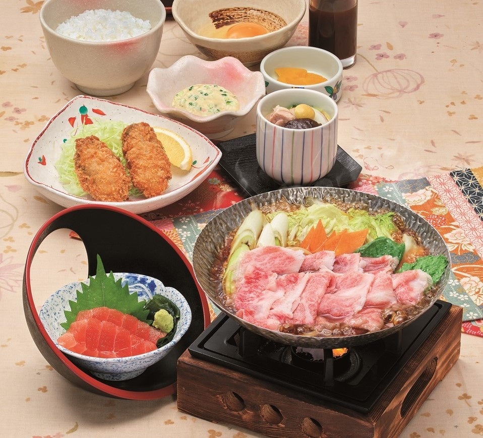 黒毛和牛「黒樺牛」のすき焼きに、まぐろの刺身、カキフライ、茶わん蒸しをセットしました。