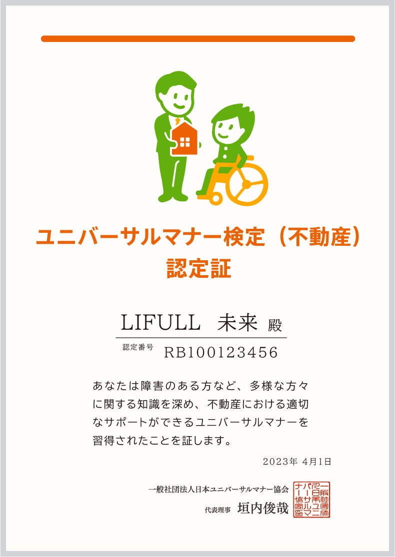 「ユニバーサルマナー検定(不動産)」は、障害者や高齢者など住まい探しにおいて何らかの障壁のある方に対する適切なサポート、必要な配慮などを体系的に学ぶことができる検定です。通常の「ユニバーサルマナー検定」の内容に加え、「不動産」は物件への問合せ時、店舗での商談時、内見時、契約時など各場面で気を付ける点を、より不動産実務に即した内容の構成です。検定受講者には、ユニバーサルマナー検定(不動産)のロゴマークが入った認定証が配布されます。