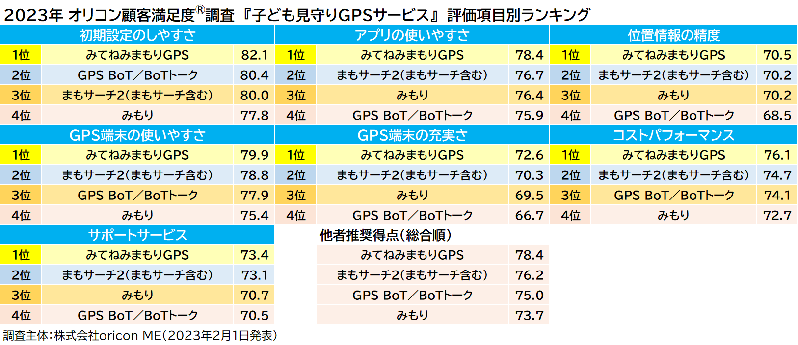 実際のサービス利用者を対象に第三者の⽴場で顧客満⾜度調査を実施する株式会社oricon ME(本社:東京都港区 代表取締役社⻑:⼩池恒 略称:オリコン)は、『子ども見守りGPSサービス』についての満⾜度調査を初めて実施し、2023年2⽉1⽇(水)14時にその結果を「オリコン顧客満⾜度® 」公式サイト( https://life.oricon.co.jp/ )にて発表いたしました。結果は以下の通りとなりました。