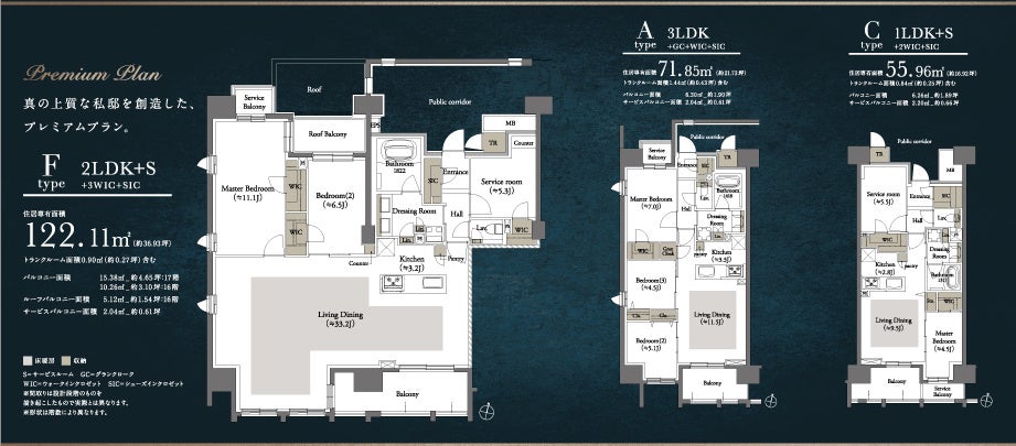 住居専有面積:54.46m²~121.21m²(※専有面積の合計は住居専有面積+トランクルーム面積です。)