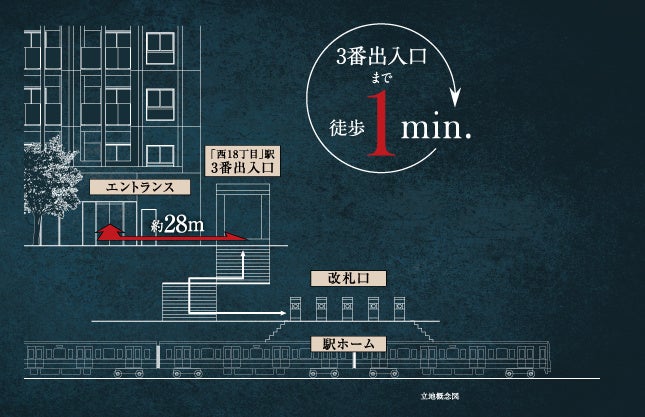 地下鉄東西線「西18丁目」駅徒歩1分。どんな悪天候にも動じない、駅直上という羨望の立地を暮らしの舞台に、いままで叶わなかった、よりアクティブで自在な行動が実現する。