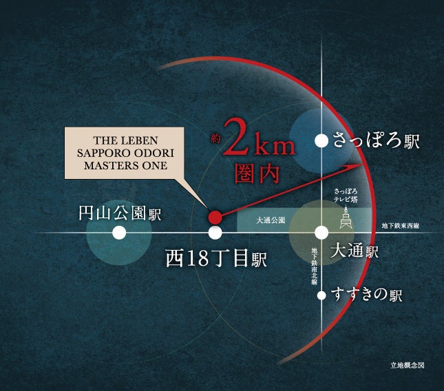 プロジェクトを中心に、半径2km圏内に札幌の全てが揃う中枢の地。「札幌」駅や「大通」駅、「すすきの」駅、「円山公園」駅など、札幌市内の主要駅を生活圏に、公園(大通公園/徒歩10分)や文化施設(北海道立近代美術館/徒歩6分)、商業施設(マルヤマクラス/徒歩13分)などあらゆる生活施設が身近になる利便性。