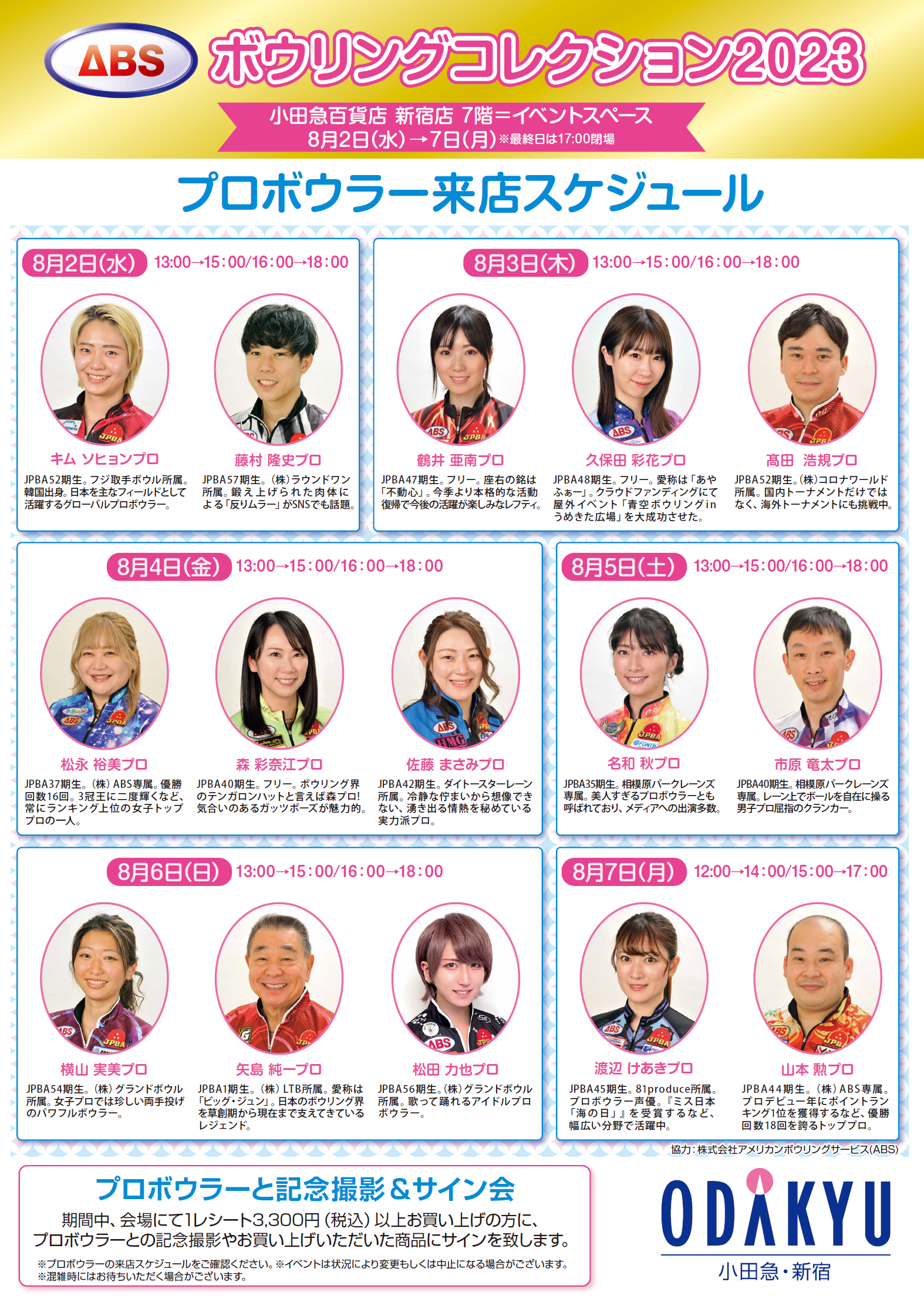 日替わりで人気プロボウラーが来店し、期間中、会場にて1レシート3,300円(税込)以上お買い上げの方にプロボウラーとの記念撮影やお買い上げいただいたアイテムにサインをいたします。